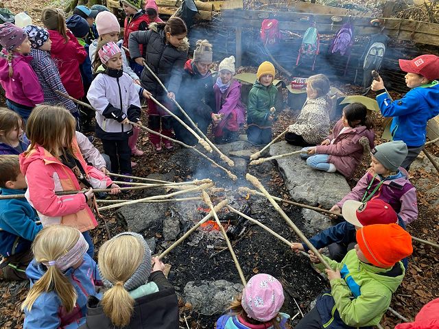 Dort entzündeten wir ein grosses Feuer. Mit viel Begeisterung schnitzten die Kinder Haselstecken, um daraus Bratstöcke für das Schlangenbrot zu machen. Mit viel Ausdauer hielten sie ihre Brotteige über die Glut, bis sie goldbraun und knusprig waren. Wer mochte, durfte sein Schlangenbrot mit einem feinen Schoggistängeli verfeinern. Eine süsse Belohnung nach getaner Arbeit!