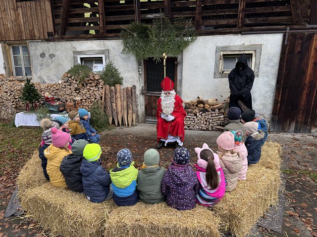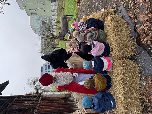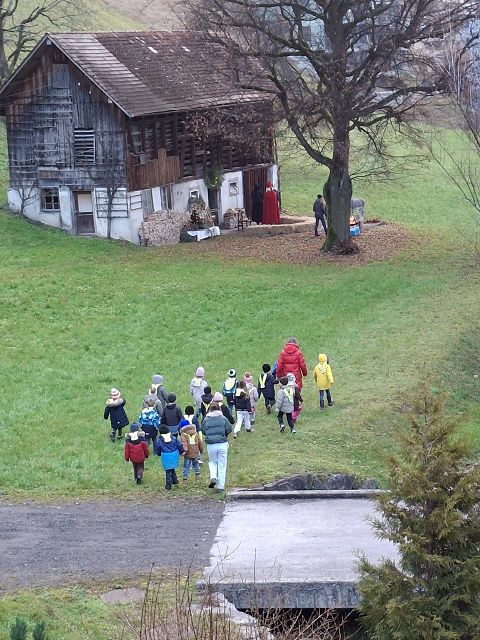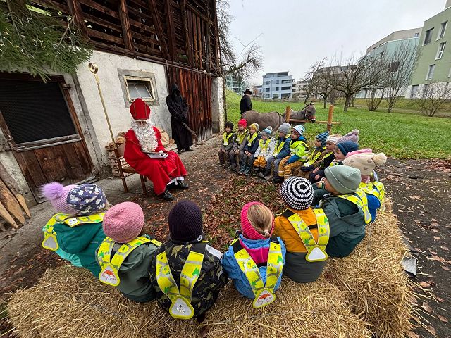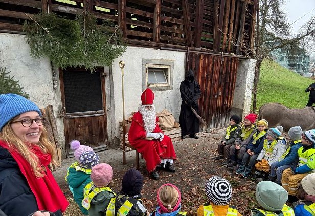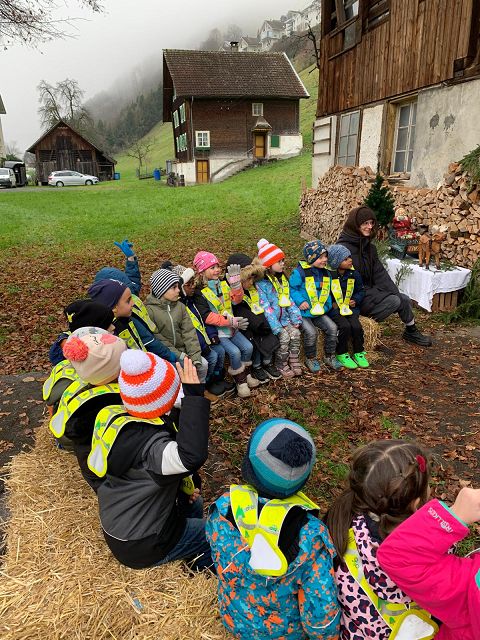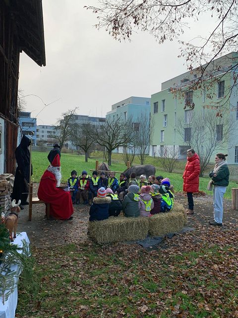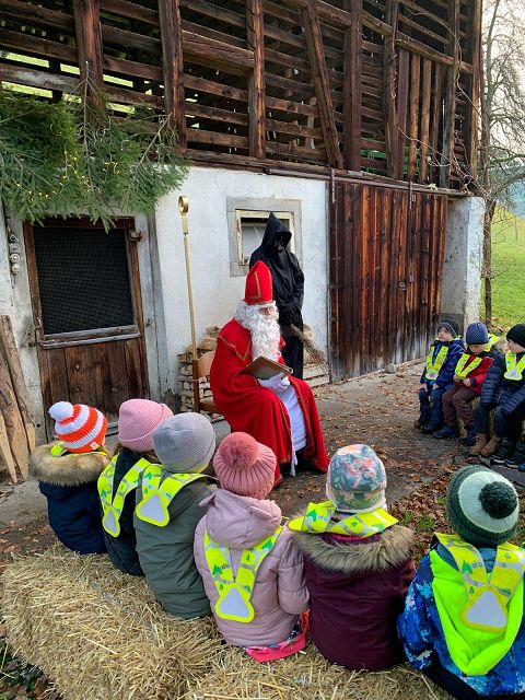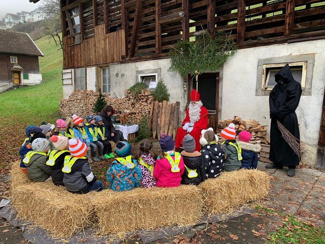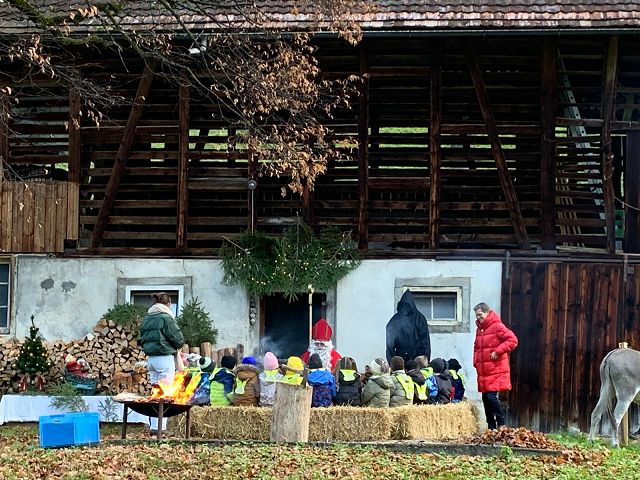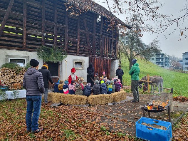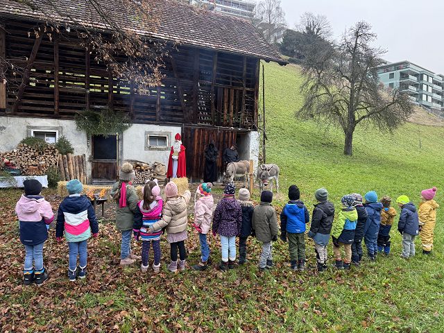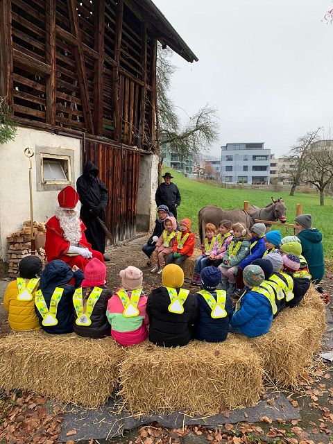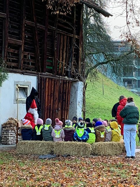 In der ersten Adventswoche besuchten alle Klassen den Samichlaus mit seinem Schmutzli und den Eseln beim Gade am Bach. Auf den Strohballen sitzend lauschten die Kindergartenkinder aufgeregt den Worten des Samichlauses. Natürlich sagten sie am Schluss ihre gelernten Sprüchlis auf und bekamen als Dank dafür einen kleinen Gritibänz.