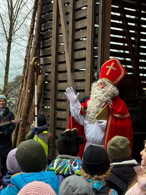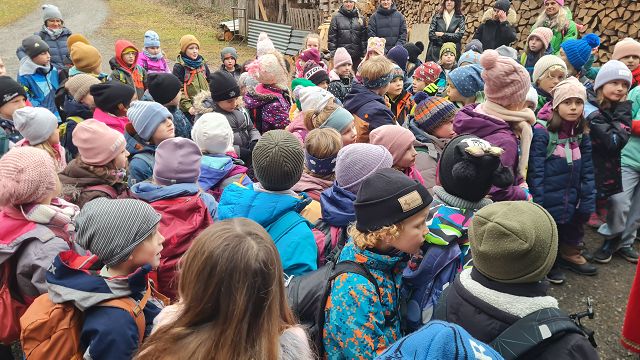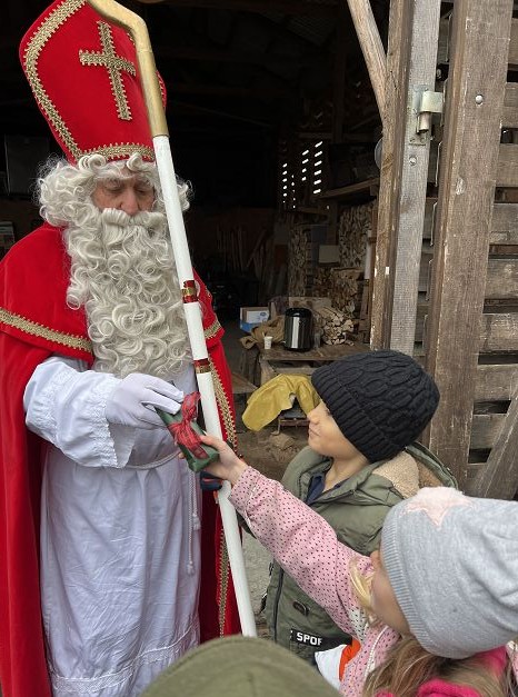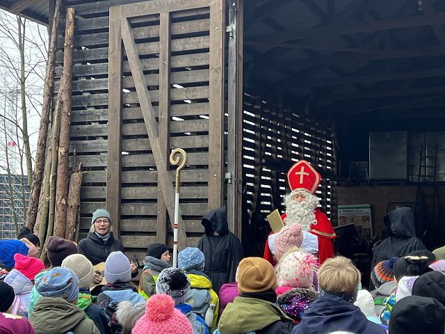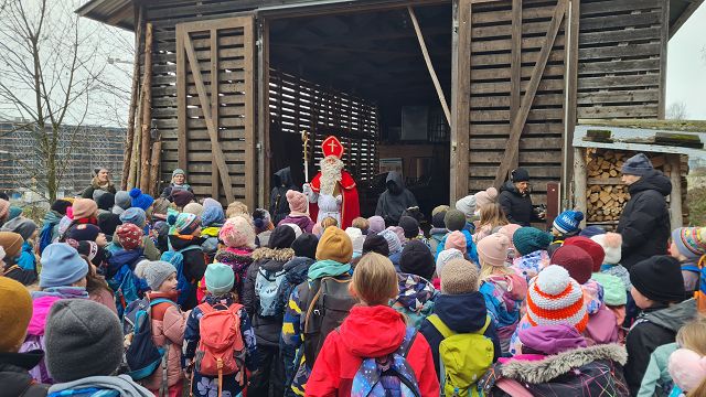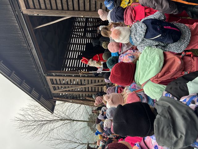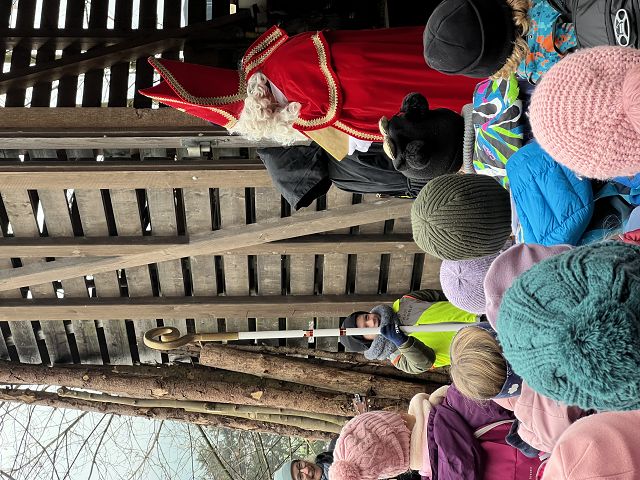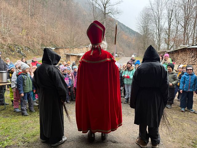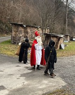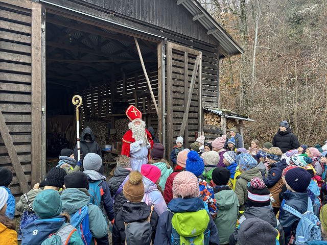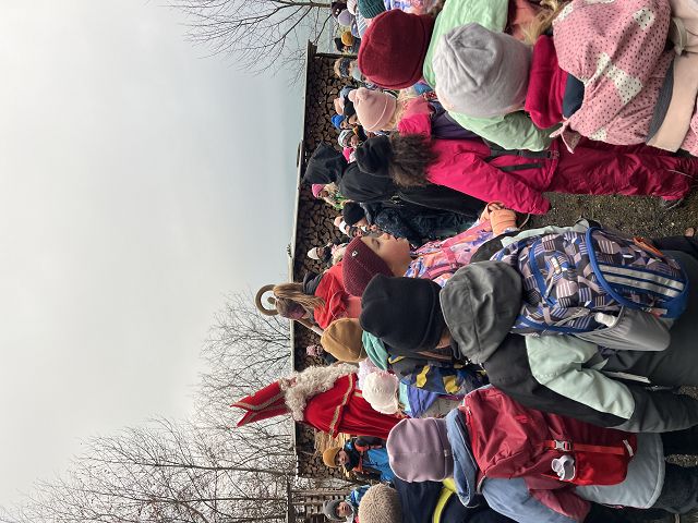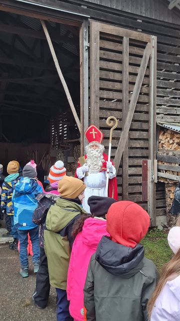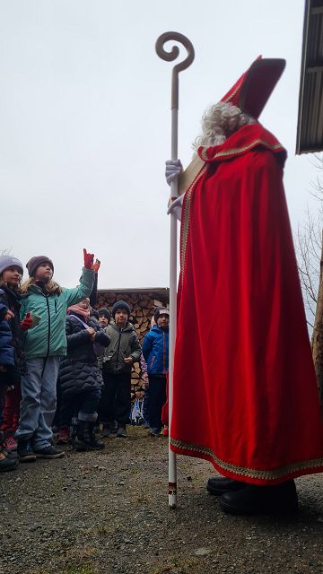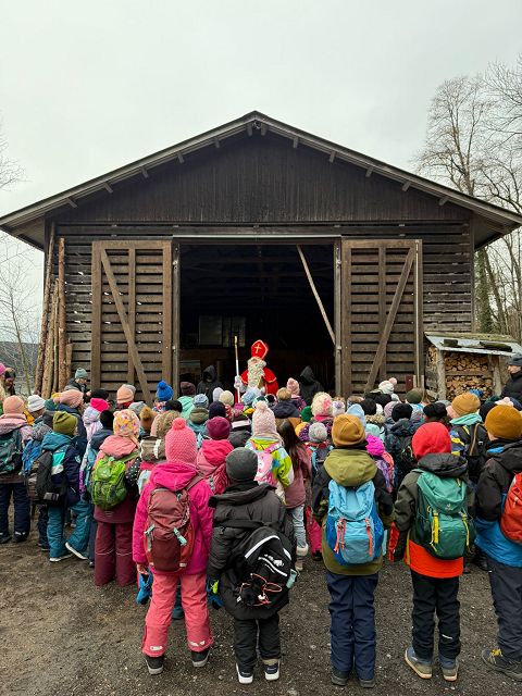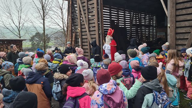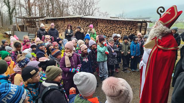 Bei kaltem und nebligem Wetter machte sich die Unterstufe auf den Weg zum Samichlaus in den Wald. Er wanderte uns mit seinen zwei Schmutzli von der Hütte im Wald entgegen und freute sich sehr, die Kinder zu sehen.