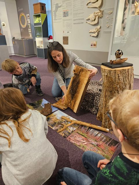 Die Kinder erfuhren viel über den Uhu, das Wildschwein und das Eichhörnchen. Besonders spannend war auch das Thema rund um den Borkenkäfer. Wir lernten, warum er für die Bäume gefährlich sein kann und wer sein natürlicher Feind ist: der Specht, der mit seinem Schnabel die Käfer aus der Baumrinde holt.